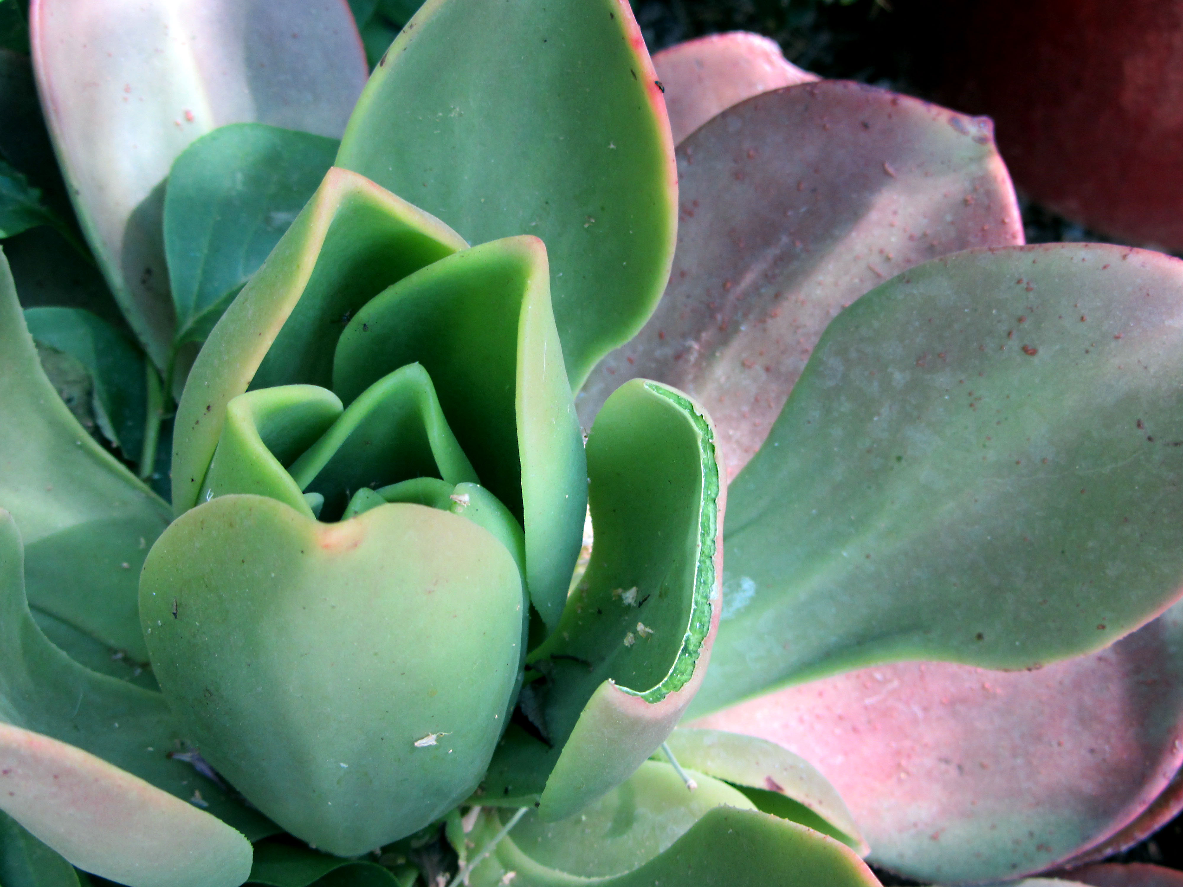 Photograph of a succulent taken May, 2012 in Tucson, Ariz. An animal, most likely a rabbit, has eaten the tip of one leaf.