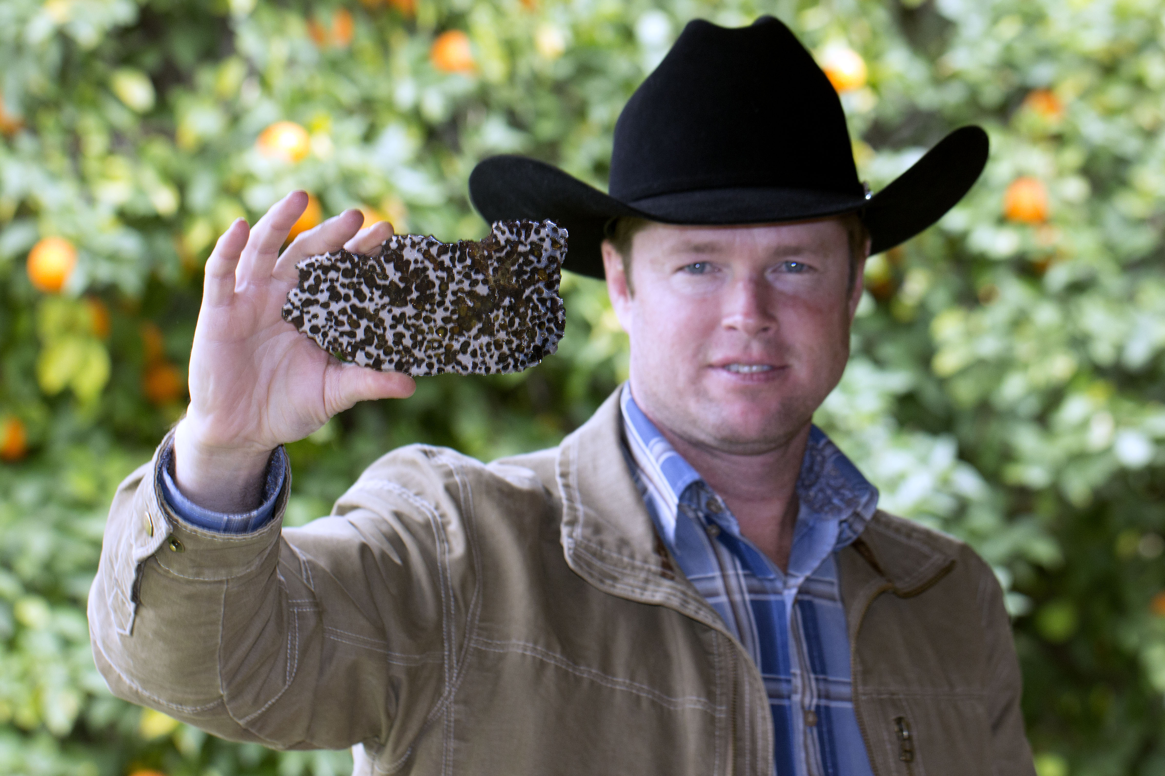 Robert Ward holds a polished section from the stony-iron meteorite he collected at the Springwater pallasite strewn field in Canada. Ward displayed a portion of his collection at Impactika, Anne Black’s shop at the 60th Annual Tucson Gem and Mineral Show. Photograph by Susan E. Swanberg.