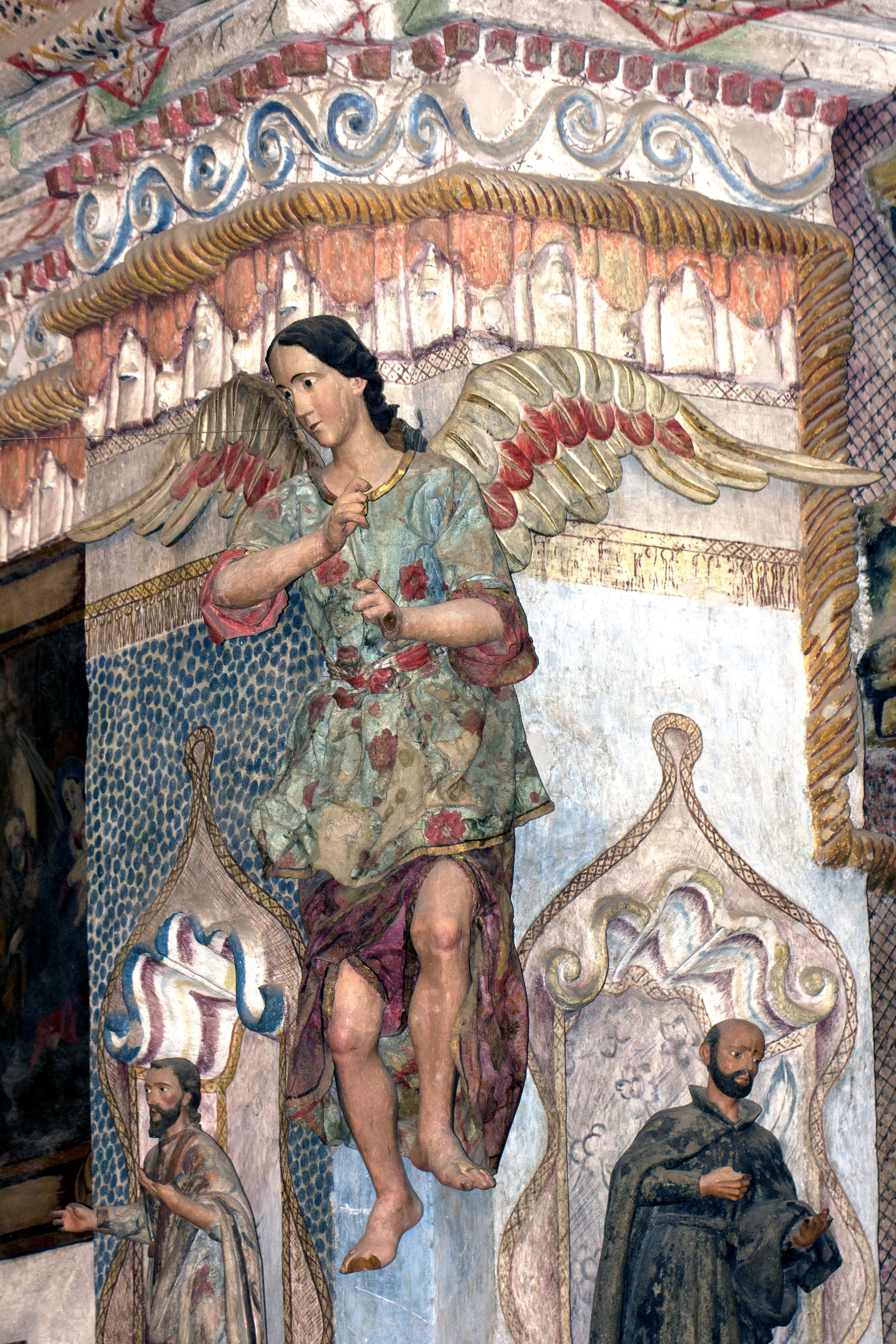 A colorful painted angel decorates the wall at San Xavier del Bac. The mission is a living, breathing church where the Mass is celebrated every day. Photograph by Susan E. Swanberg.