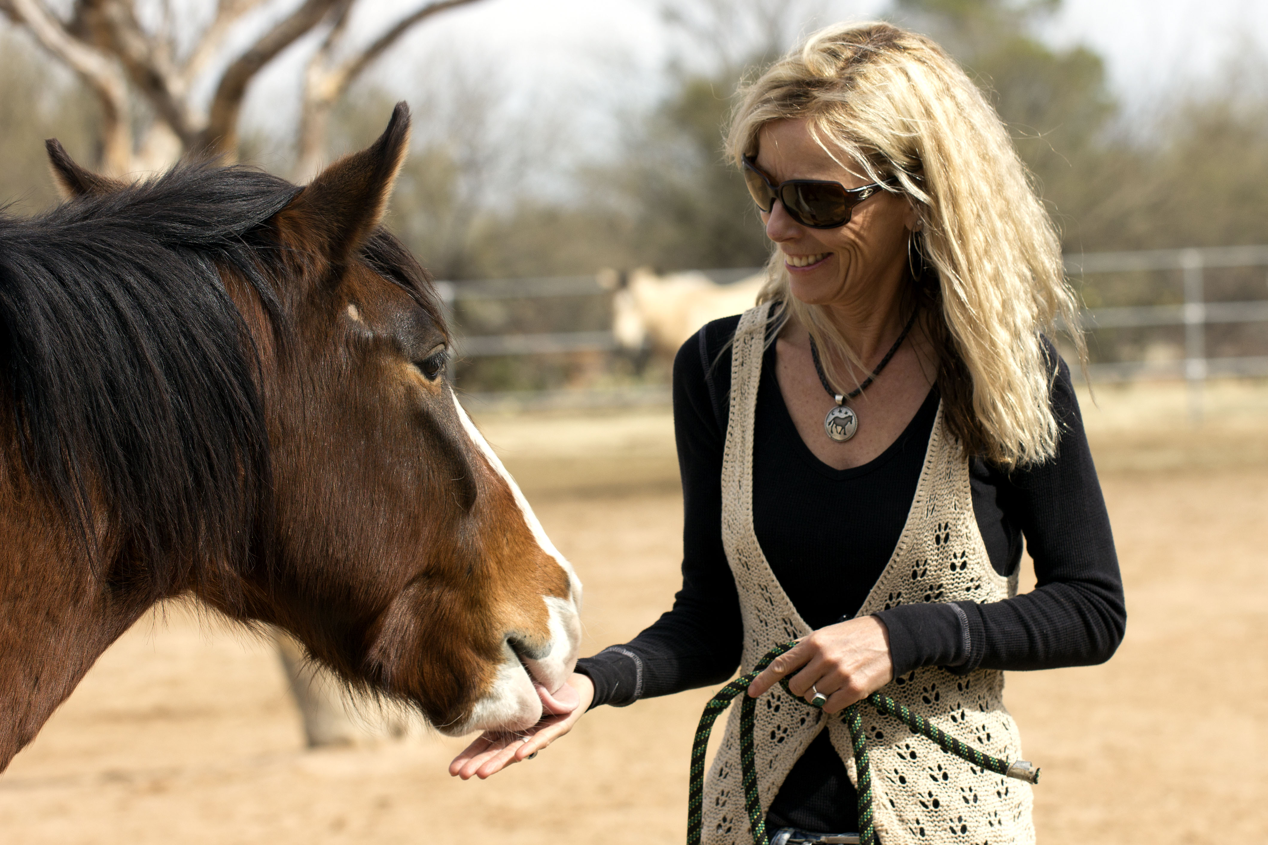 Karen Pomroy, of Equine Voices, greets Blaze. Blaze is a “wild” Sahuarita horse who now lives at Jumpin’ Jack Ranch. Photograph by Susan E. Swanberg.
