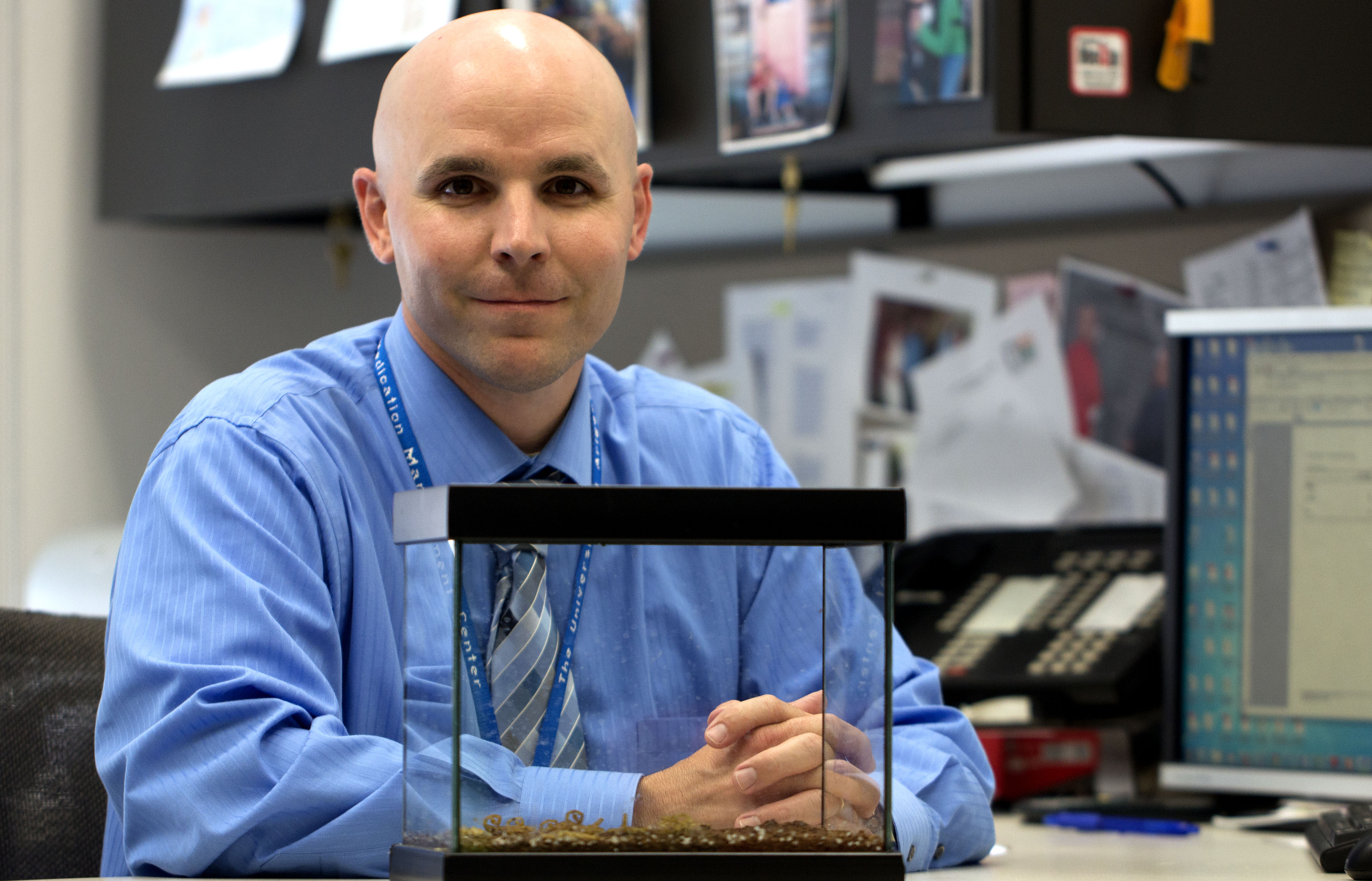 Keith Boesen, PharmD, Director of the Arizona Poison and Drug Information Center sits at his desk with a terrarium of Arizona bark scorpions on April 15, 2014. Boesen manages the day-to-day operations of the poison center. Photograph by Susan E. Swanberg.